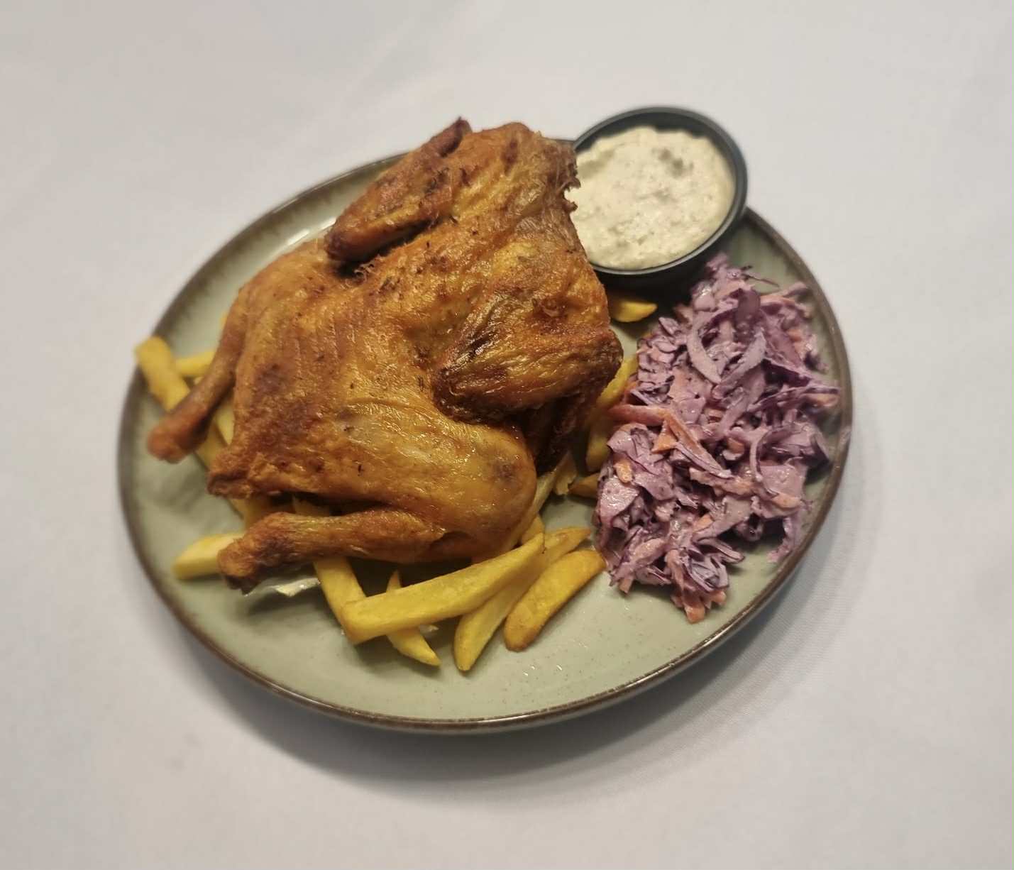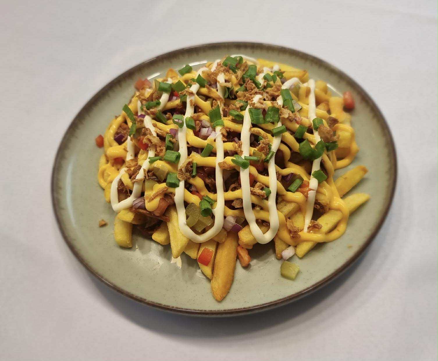 bulvytės fri, traški vištiena, pomidorai, agurkai, svogūnai, paprikos, aitriosios chalapos paprikos, čederio sūrio padažas, majonezo padažas