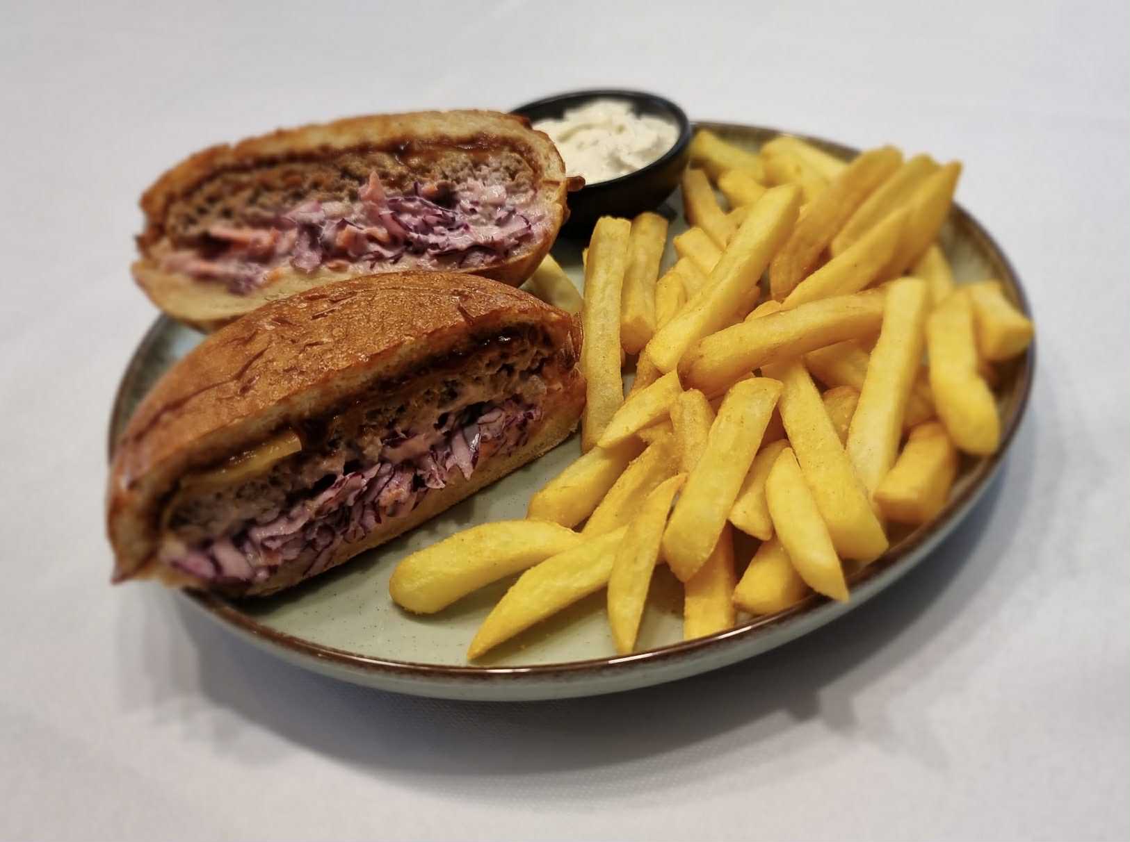mėsainio bandelė, jautienos paplotėlis, coleslow salotos, marinuoti agurkai, marinuoti svogūnai, BBQ padažas, česnakinis padažas, bulvytės fri, padažas